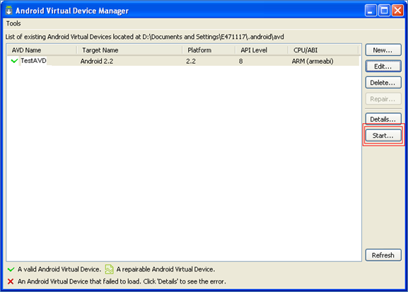 Setting up the AVD (android virtual machine) and emulator should not be any issue, as it's sufficiently written and explained at http://developer.android.com/sdk/index.html . Once the AVD is setup, we can start it by going to Start-> All Programs-> Android SKD tools-> AVD manager or by entering the following command: