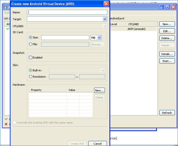 It will start as shown in Fig-1. We can create several AVDs using the AVD manager by click on the 'New' button and providing a name, size and other inputs to it [Fig-2].