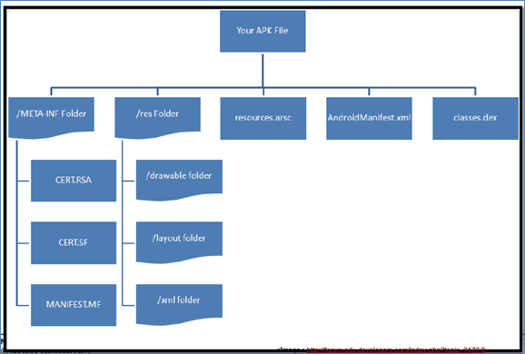 Now this way of assessment is done through decompiling it back to source code and do code review. This is also helpful in situations where the application is a native app and doesn't communicate over HTTP. Decompiling gives you source code and access to configuration files as well, which are the source of permissions assigned to the app. The structure of a sample android app is shown in Fig- 8 (http://securitycompass.com )