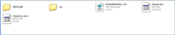 The same extracted folder contains one xml file called AndroidManifest.xml. It contains all the properties settings of the application installed such as, permissions to access other apps, other apps' permissions to access this app, intents, etc… The problem here is this xml file couldn't be read easily as normal xml files because this is in binary format. We need a special tool to convert it to a human friendly format. For that purpose, we will use a tool called AXMLPrinter2.jar (http://code.google.com/p/android4me/downloads/detail?name=AXMLPrinter2.jar& ).