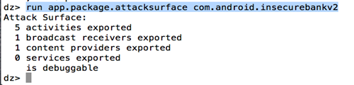 Another useful module is app.package.attacksurface. It tells you about the exported components as well as whether the application is debuggable or not. We will look at exploiting debuggable applications in later articles.