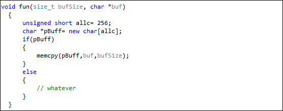 In this sample, the code is allocating space based on a 16-bit short integer, but the actual memory copy is being made using a 32-bit size_t, which is literally an indication of potential truncation bug, where more data than the allocated could be copied in the buffer.