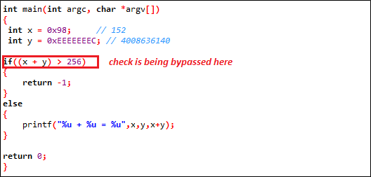 Though this code successfully compiles but will produce an unexpected result as -155536 because such addition is too big a number to fit in 15 bits. Therefore math overflows and the sign will be changed. This buffer or numeric overflow bug is presuming as a code level defect, typically emerges in those software's that's source code written in C and C++ programming. Whereas, code written in a .Net language on the other hand, controlled or executed by the Common Language Runtime which provides an abstraction layer for memory and object management functions and furthermore, preventing vulnerabilities, such as buffer overflows, integer overflows, and format string vulnerabilities, occurred due to poor memory management. Integer overflows appear because the values stored in integer type limited by the size of the data type itself. Let's consider the following code as;