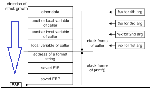 Format string attacks typically use the %x and %n specifiers in particular. However, the others can be used to crash either the machine or advance through the stack. What is truly happening in the preceding demonstration, when the number of actual arguments does not correspond to the number of tokens in the format string, the output includes various bits of the stack. The following figure shows the reading of four values from the stack and prints them in abusive manner as;