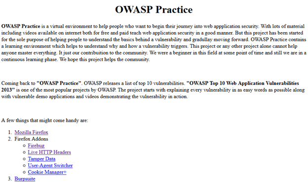 OWASP Practice is a virtual environment to help people who want to begin their journey into web application security. Lots of material including videos are available on the Internet, both for free and for a fee, that teach web application security in a good manner. But this project has been started for the sole purpose of helping people to understand the basics behind vulnerability and gradually moving forward. OWASP Practice contains a learning environment which helps us to understand why and how vulnerabilities are triggered. This project or any other project alone cannot help anyone master everything. It just our contribution to the community. We were all beginners in this field at some point of time, and still we are in a continuous learning phase. We hope this project helps the community.