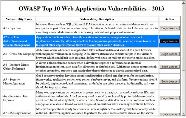 Coming back to "OWASP Practice", OWASP released a list of top 10 vulnerabilities. "OWASP Top 10 Web Application Vulnerabilities 2013" is one of the most popular projects by OWASP. The project starts with explaining every vulnerability in as easy words as possible, along with vulnerable demo applications and videos demonstrating the vulnerability in action.