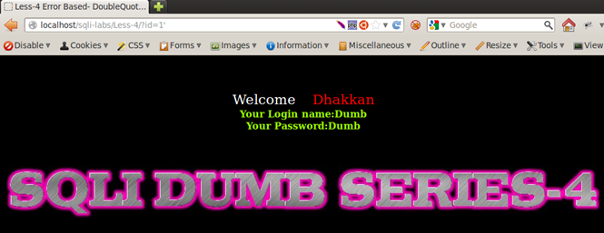 Therefore, from the above tests, we have discovered that the applications Less-1, Less-2, and Less-3 are reactive to a single-quote injection and Less-4 is to a double-quote injection.