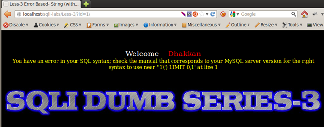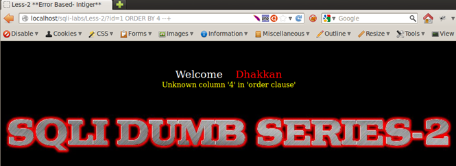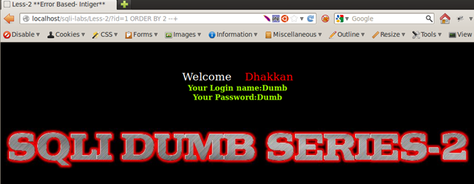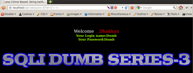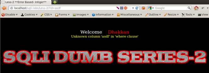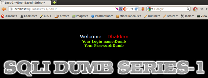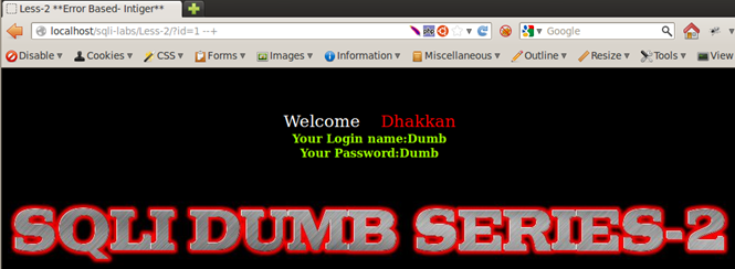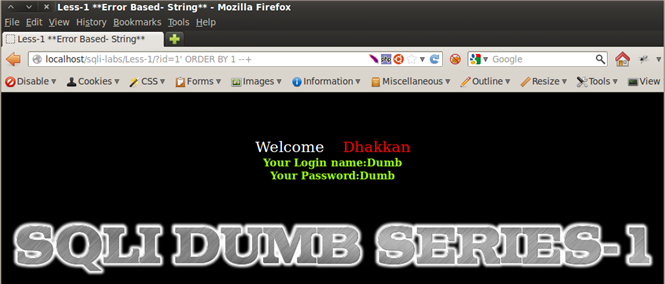 Result of Integer and String Test: We see that Less-1, Less-3, and Less-4 respond by returning the empty set, whereas Less-2 returns a different behavior; it displays a MySQL error message on screen. From very basic programming knowhow, we know that a string parameter is always wrapped in single quotes or double quotes, whereas integers are used as is. Therefore we can assume that Less-1, -3, and -4 are using some sort of quotes to wrap around the user input. They consider the string entered as a non-existent value in the database and therefore respond with the empty set. Less-2 is producing a MySQL alert, meaning that there are no quotes used around the input parameter, therefore integer values work fine in a query but strings cause an error. Therefore we can deduce that Less-1, Less-2, and Less-3 are string-based injections and Less-2 is an integer-based injection.