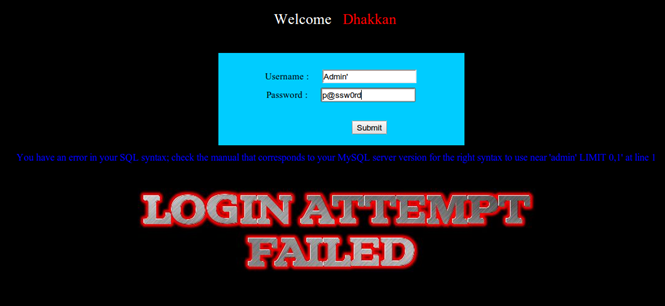 Now the developer assumes that users of his application will always put a username and password combination to get a valid query for evaluation by database backend. What if the user is malicious and enters some characters which have some special meaning in the query? For example a single quote. So, instead of putting Admin, he puts Admin', thereby causing an error thrown by the DB driver. Why? Because of the unpaired quote entered by the user breaking the application logic.