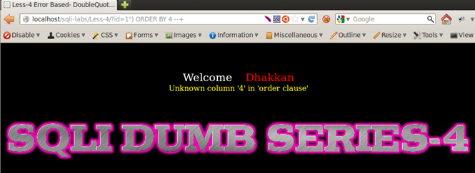Trying the same exercise with a double quote injection, we observe that this time only Less-4 crashes the application and Less-1, Less-2, and Less-3 do not crash it anymore.