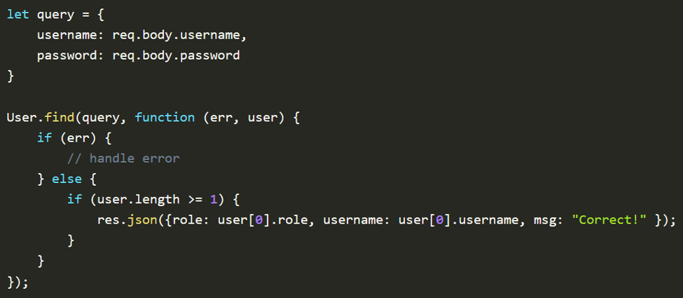 For example, the screenshot above (from NullSweep) shows an application that is vulnerable to NoSQL injection. From a request, the code pulls a username and password and places it into a MongoDB query without performing any input sanitization. By passing the JSON {"username":"myaccount","password":{"$ne": 1}} , an attacker could authenticate to the service without a password.