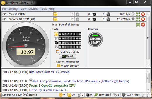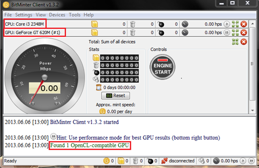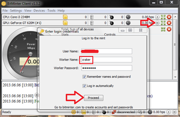 We can see the BitMinter client software in the above figure. In the top left side it shows my CPU processor name and below that is my GPU name, GeForce GT 620M. In the status panel we can see it showing the message "Found 1 OpenCL-compatible GPU," which means my GPU card is detected by this software. Now we can start our mining process. Run the program and click on the play button and then it will ask for your pool server account details which we already created. Give the details and then click on Proceed.