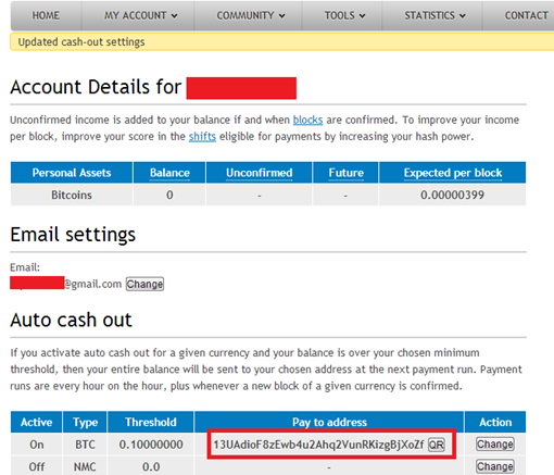 Now go to the account details option and there you will find your cash out settings. Add your Bitcoin address there; once you have earned Bitcoins, you can transfer them into your wallet via that address.