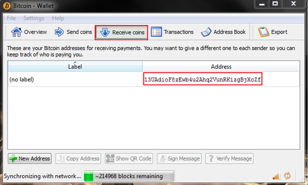 We can see the overview of Bitcoin wallet in the figure above. Our balance is showing 0.00BTC, which means we have nothing right now. We also see few options in upper side bar: send coins, receive coins, transactions, address book, and export. Now we can see in the figure below, in the Receive coins option, a long alphanumeric string under the address tab. This is our Bitcoin address, which is used for transactions, mainly for receiving Bitcoins in the form of payments. It is more like a bank account number which is used for sending or receiving money. It is a cryptographic public key in human-readable strings and it consists of alphanumeric characters, for example, 17zMBU1enmZALpbDPeo5UGXFYBWbAg7MdR