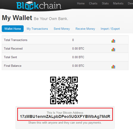We can see what our online wallet it looks like in our client software. We have our Bitcoin address and we can see the account balance also, which is zero. And the same options are available here from the Bitcoin client software: Send Money, Receive Money, My transactions, and import/Export.