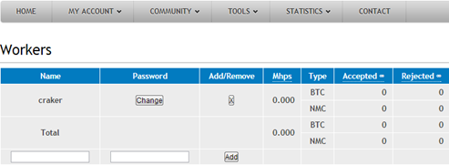 In above figure we can see that the signup form asks for Worker name and password. Basically, for every miner that you have running, you will need to have a worker ID so the pool can keep track of your contributions. You can also see this worker after creating the account by going to MY ACCOUNT> Workers and here we can see our worker name, craker, is showing.