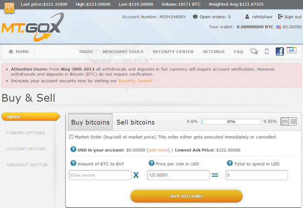 There are many online vendors who are trading in Bitcoins, such as BIPS, Bitbox, MtGox, bitNZ, Bitstamp, BTC-E, VertEx, etc. Here we are going to show you how to purchase Bitcoin from these vendors; for example, we are using MtGox for purchasing. Go to the following website https://mtgox.com/ and sign up for an account. We can see in the figure below how it looks after signing in.