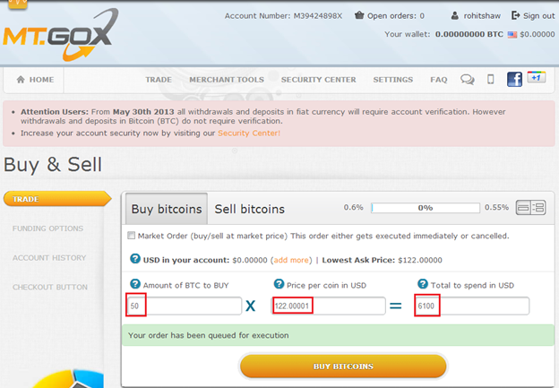 We can see in the above figure that there are two main options: Buy bitcoins and Sell bitcoins. If you want to buy, just give the number of Bitcoins in the Amount of BTC to BUY section and we can see that the price per coins is 122.00001 US dollar. Suppose we are buying 50 BTC; let us see how much USD we have to spend.