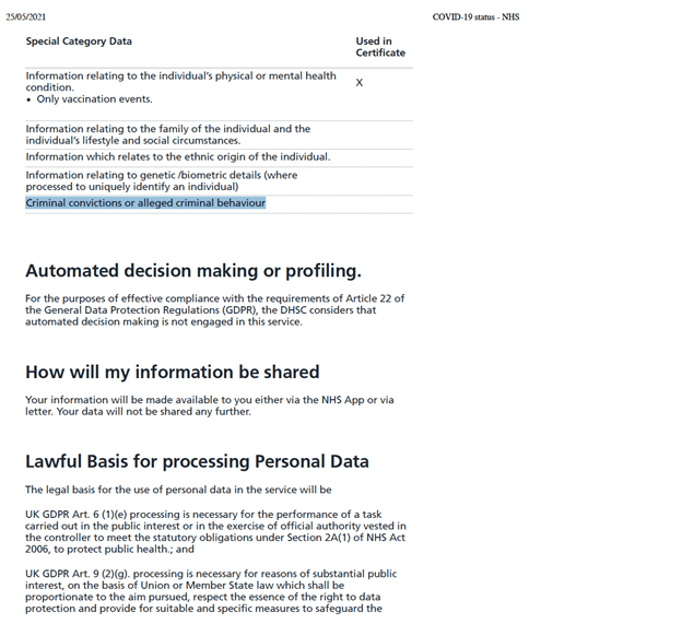 This contextual view of data from both Renieris and Wilson is a very important aspect of achieving a system where privacy is firmly placed. The type of data held within a blockchain and represented by a DID must have robust governance. The data registered therein, may be highly sensitive and be placed by a state entity or other organization without a person’s consent. For example, in the UK, the NHSX Covid vaccination app’s privacy statement originally showed an intent to not only hold health data but other data, too. In an earlier version of the privacy policy of the app (an extract shown below), it clearly stated that data such as “criminal convictions or alleged criminal behavior” would be stored.