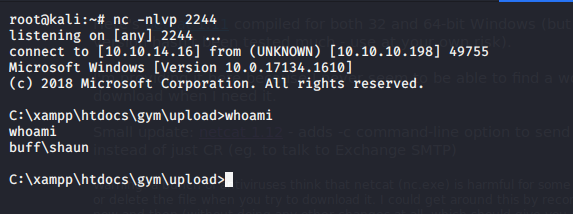 - Let’s upload nc or a PowerShell one-liner to the machine and get a more stable shell back.