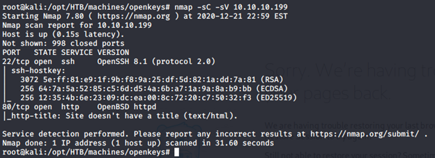 - As usual, let’s start with the Nmap scan to gather more information around the services running on this machine. [CLICK IMAGES TO ENLARGE] nmap -sC -sV -oA OpenKeyS 10.10.10.199