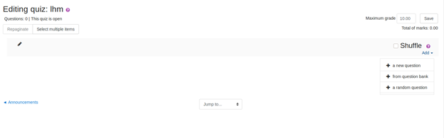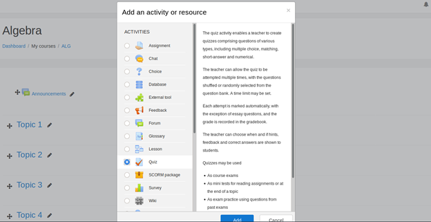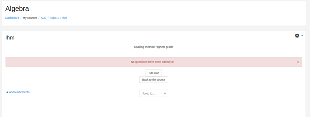 - Under the course, algebra, add a new quiz