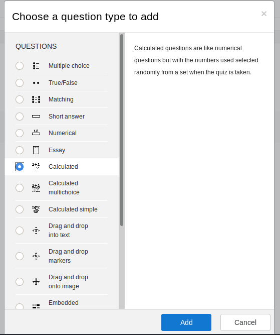 - Edit the quiz and add a question type. In this case, the type is calculated