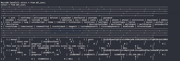 - Under moodle DB, there are a lot of tables. Under the tables, we get mdl_user, which has the passwords