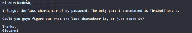 - It looks like Giovanni is a user and there is a password as well without the last letter. But where to log in? Let’s go back to enumeration