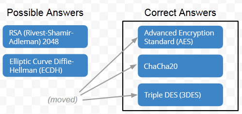 To solve the question, simply click, drag and drop each correct answer from the "Possible Answers" section to the "Correct Answers" box. In this case, we should drag-and-drop AES, Blowfish and Triple DES into the "Correct Answers" box.