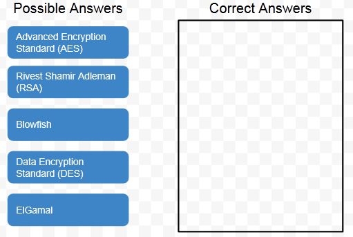 To solve the question, simply click, drag and drop each correct answer from the "Possible Answers" section to the "Correct Answers" box. In this case, we should drag-and-drop AES, Blowfish and Triple DES into the "Correct Answers" box.
