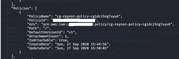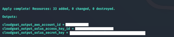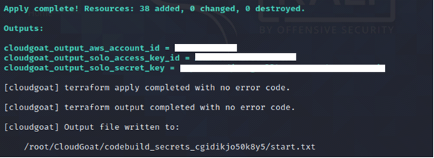 CloudGoat processes the Terraform configuration, deploying all necessary resources. Upon completion, it provides crucial information, including IAM credentials for the starting user, scenario objectives, and hints for beginning your exploitation chain.