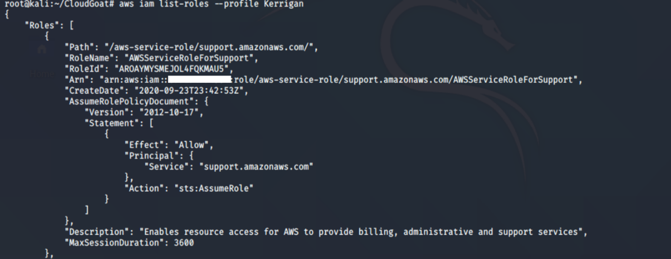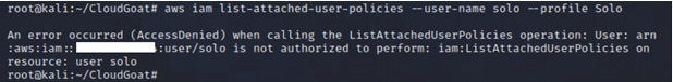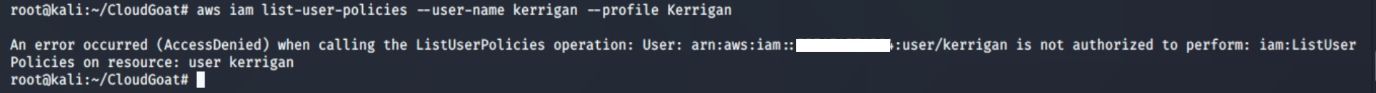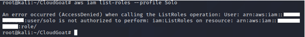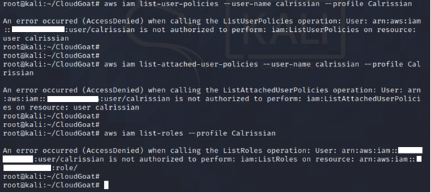 We tried running the usual commands list-user-policies, list-attached-user-policies and list-roles and noticed we were unauthorized to carry out those actions.