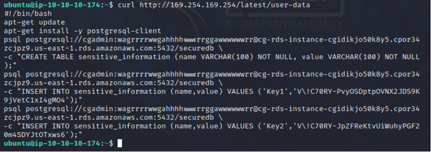 Since we have access to the EC2 instance, we query the user data to see if there is any information there.
