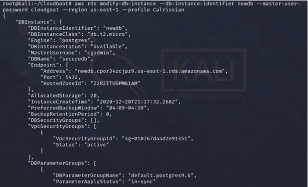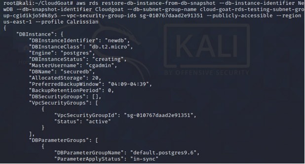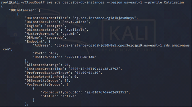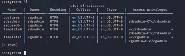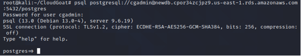 Continuing with our recon, we find an RDS database instance using PostgreSQL. However, IAM user Calrissian doesn’t have access to the database.
