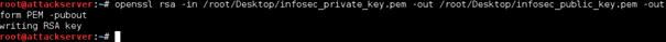 openssl rsa -in /root/Desktop/infosec_private_key.pem -out /root/Desktop/infosec_public_key.pem -outform PEM –pubout