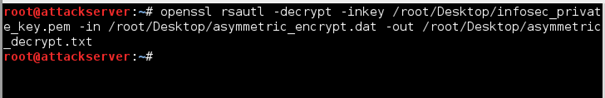 openssl rsautl -decrypt -inkey /root/Desktop/infosec_private_key.pem -in /root/Desktop/asymmetric_encrypt.dat -out /root/Desktop/asymmetric_decrypt.txt
