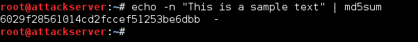 To get an MD5 hash of a plaintext phrase using your terminal, execute the following command: echo -n "This is a sample text" | md5sum
