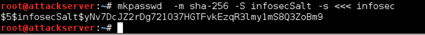 mkpasswd -m sha-256 -S infosecSalt -s <<< infosec