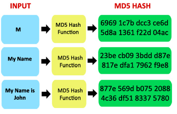 The difference between encryption either symmetric or asymmetric and hashing is the fact that hash functions are not reversible, no private key, passphrase or password is used, and almost all hashing function produce a fixed length output from a given arbitrary length input. The main point of difference is the one-way mapping between the input and the output. It's theoretically impossible to get a plaintext from a hashed value. The two most commonly used hash algorithms are MD5 and SHA1 with the respectively fixed length output of 32 characters and 40 characters.