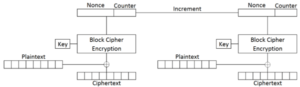 A simple alternative to ECB mode is Counter (CTR) mode. As shown above, CTR mode uses the combination of a random nonce and an incrementing counter as the input to encryption. The result is XORed with the plaintext to produce the ciphertext. Since every block has a different input due to that incrementing counter, identical blocks produce different ciphertexts. However, it is essential that the nonce is unique for each stream of encryption; otherwise, corresponding blocks in two streams will be encrypted using the same values.