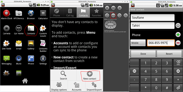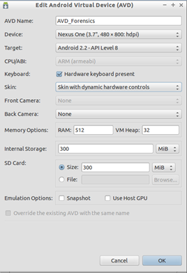 Select Tools –> Manage AVDs. Click "Create…" Enter a name for your Android Virtual Device (AVD_Forensics). Choose a device (Nexus One) then the OS (API Level 8) of your new AVD from the "Target" drop-down list. Allocate RAM (512 Mib), Internal Storage (300 Mib) and SD card size (300 Mib) then click OK: