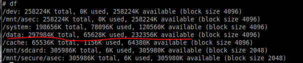 As highlighted in the screenshot above, the /data partition is at /dev/block/mtdblock1, you can execute "df" command to displays the amount of disk space available on this partition: