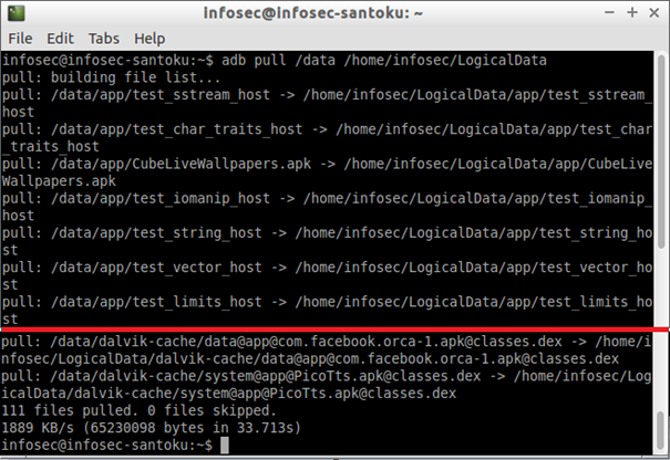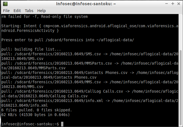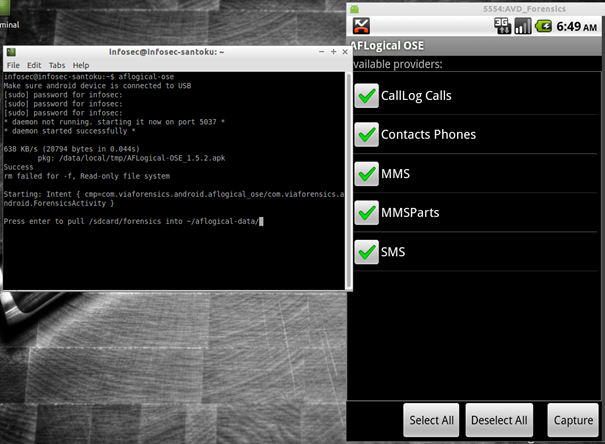In order to use this tool, open a terminal window and type in: aflogical-ose (ose stands for Open Source Edition) once asked to enter root password [sudo] password for infosec: type in the password you used to log into Santoku (root password is infosec458$%*) then wait until you get Press enter to pull /sdcard/forensics into ~/aflogical-data/