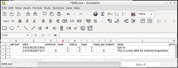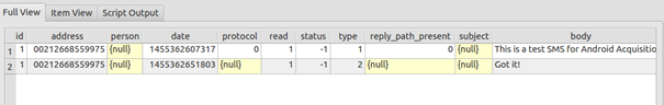 By querying, for example, the SMS table (double click on the table to view it), we can find all SMS (and using other tables and columns we can correlate IDs to make solid evidence). The following is the SMS we've sent previously: