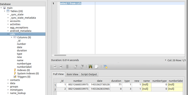Moreover, by querying each table you can get very useful information such as calls history: (select * from calls)