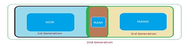 Initially, when smartphones were released, memory configuration evolved, including NAND flash memory. This development of NOR, NAND and RAM memory is considered second generation. This generation of memory configuration stores system files in NOR flash, user files in NAND and RAM is utilized for code execution.