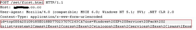 The decoded string has the pattern "d.php?f=[0-9]{1,2}&e=[0-9]{1,2}". This URL is then used to perform other malicious downloads. This URL was analyzed to download Trojan.Carberp that posts a unique id to the command and control server, which is used during a transaction between the Trojan and the command server. The URL has the pattern "/set/task.html" and posts all the running processes from the victim's computer to the command server. The URL has the pattern "set/first.html" and the data posted has the pattern "id=(Unique number posted on /set/task.html)&os=(Name-version of OS)&plist=(List of all running processes)"