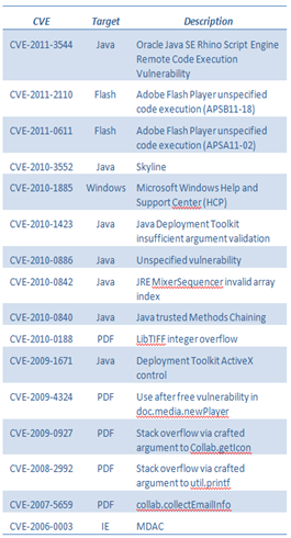 List of some vulnerabilities targetted by Blackhole Exploit kit