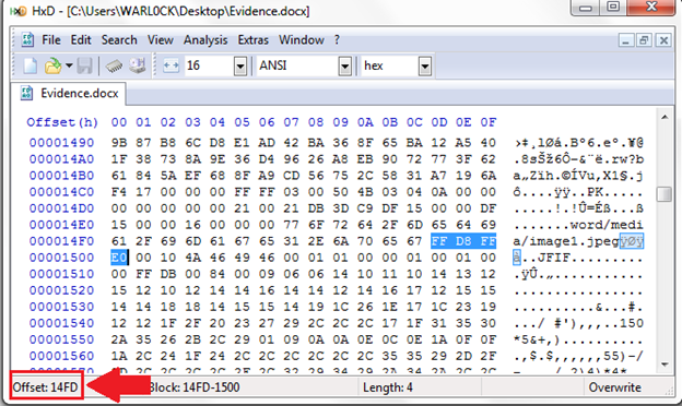 You should find a JPG header signature at offset 14FD. This location is very important and should be noted for future reference.